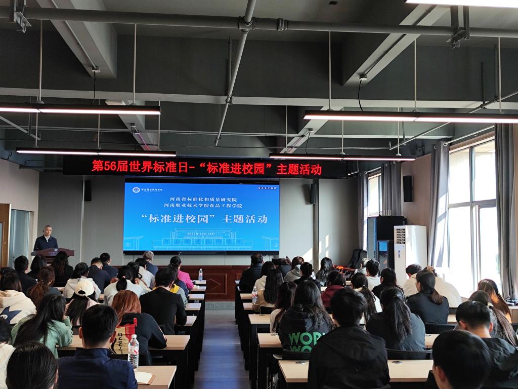 10月14日下午,学校携手河南省标准化和质量研究院,在合鼎楼719室启动“标准进校园”专业教育活动。校党委委员、纪委书记盛兴文出席活动并致辞。河南省标准化和质量研究院领导郭敬东及核心专家团队,学校科技开发处、食品工程学院相关负责人及师生代表齐聚一堂,共同开启一场“标准赋能食品行业,校院协同培育人才”的深度对话。