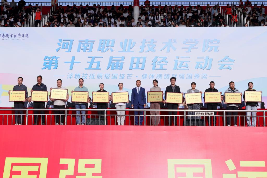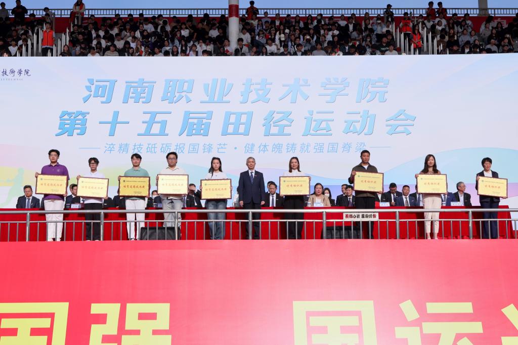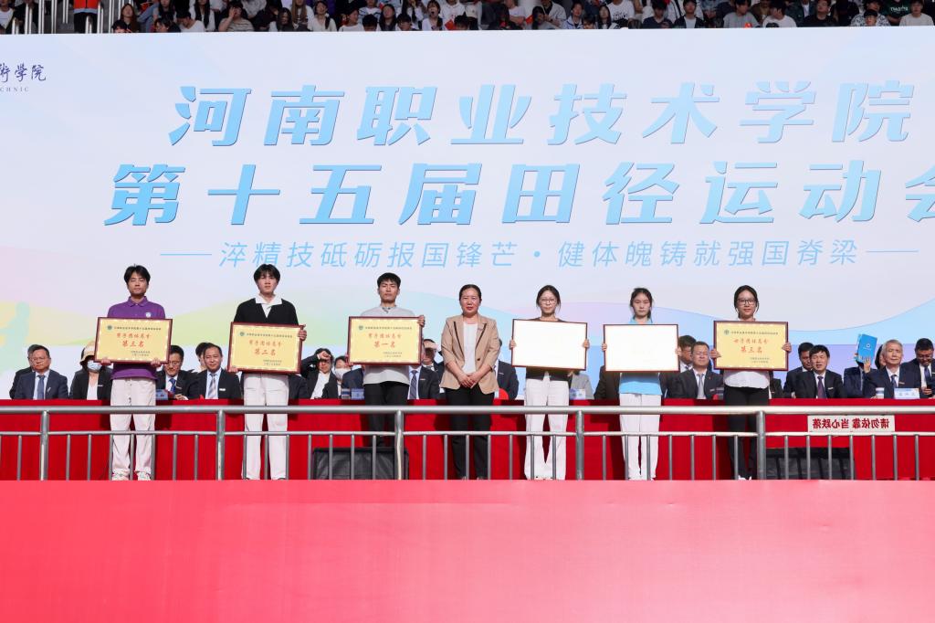 4月23日下午,河南职院第十五届田径运动会正式落下帷幕。闭幕式在学校田径运动场举行,校领导夏新颜、田华、李玉峰、盛兴文、朱永宽出席闭幕式,各单位负责同志和师生代表参加闭幕式。闭幕式由校党委委员、副校长任枫轩主持。