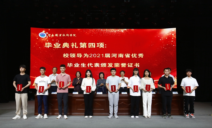 校工会主席夏喜利同志宣读了河南省2021年优秀毕业生表彰文件及我校2021年杰出毕业生表彰文件;校领导为毕业生代表颁发了毕业证书,为河南省优秀毕业生代表颁发了荣誉证书,为我校三位杰出毕业生颁发了荣誉证书及奖金。