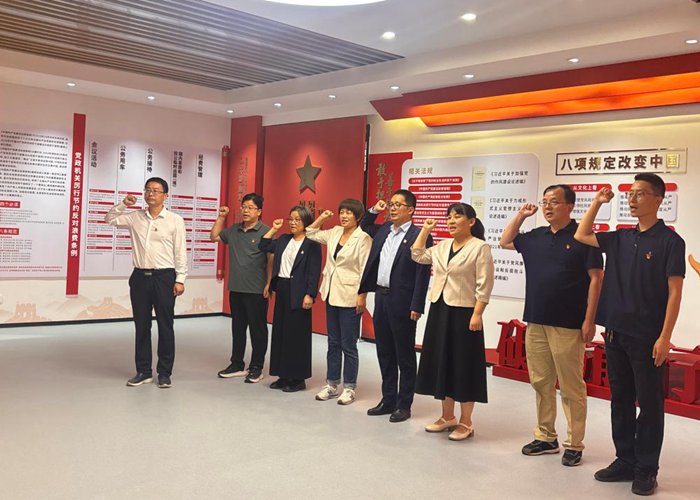 全体党员面向党旗庄严宣誓,重温入党誓词,进一步坚定理想信念。随后,党员们共同参观了学习教育馆。馆内陈列涵盖党的纪律建设历程、党风廉政重要制度、典型警示案例等内容,通过图文展示,系统呈现了全面从严治党的发展历程和成效。