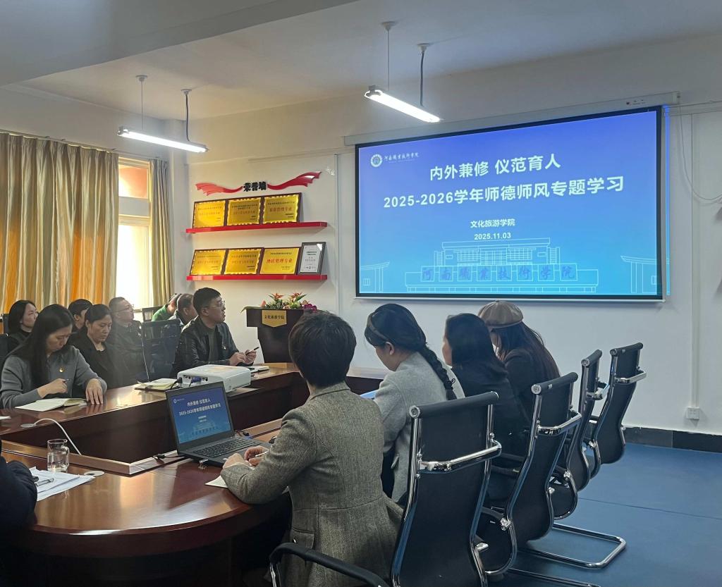 近日,学校文化旅游学院在笃行楼630会议室组织召开了“内外兼修 仪范育人”师德师风专题学习会,旨在认真落实学校《关于开展师德师风专题培训的通知》相关工作部署,切实加强和改进新时代学院师德师风建设。