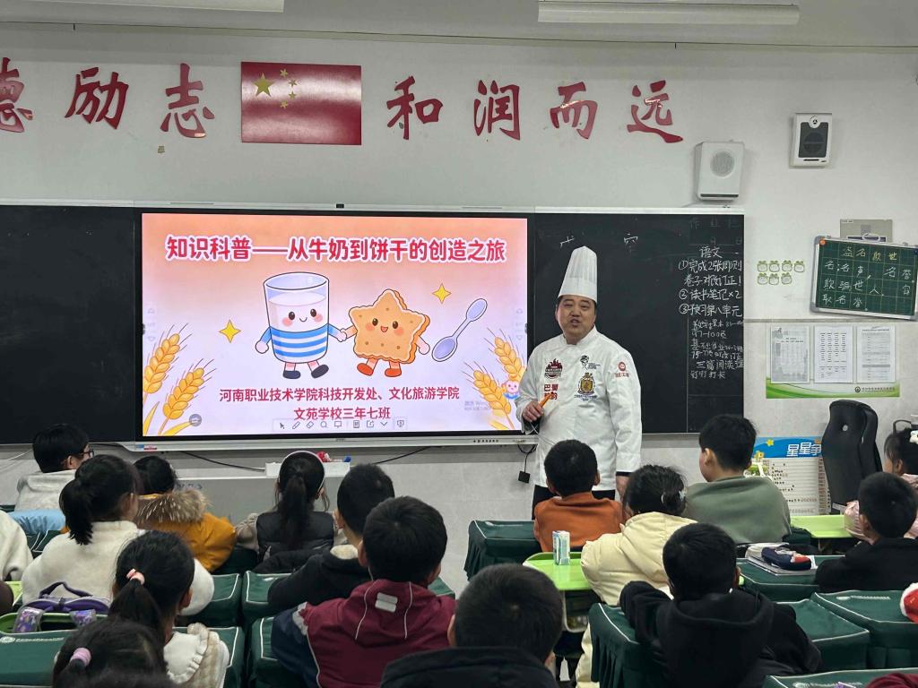 近日,学校文化旅游学院中西面点工艺及烹饪工艺与营养专业携手科技开发处,走进文苑小学,为小学生们带来了一场别开生面的“乳脂的科学奇迹:从牛奶到饼干的创造之旅”食品科普实践活动。此次活动旨在将专业知识转化为生动的科普教育资源,在孩子们心中播下科学的种子。