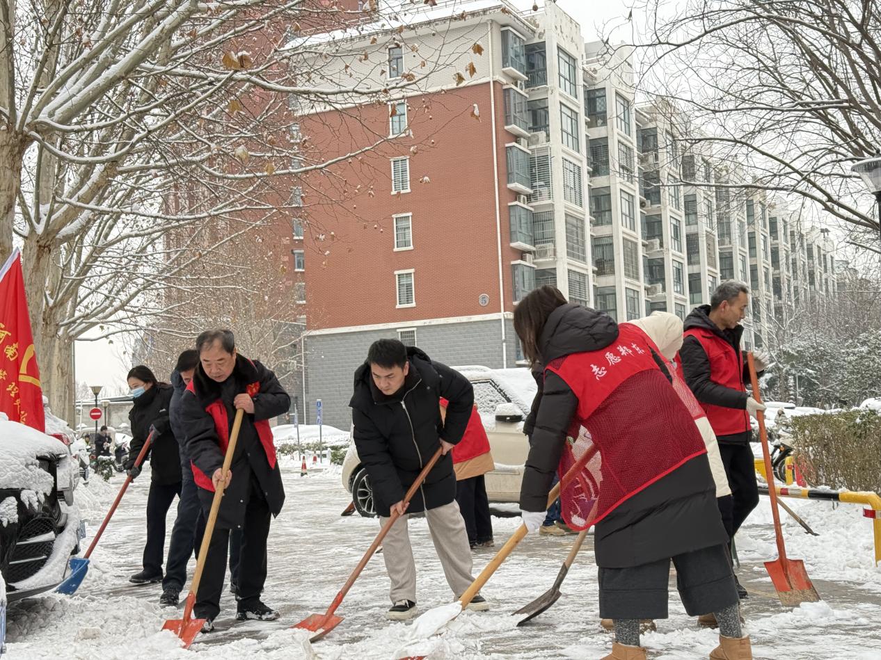 活动现场,党员志愿者们不畏严寒,手持铁锹、扫帚等工具组成除雪队伍。大家分工协作、配合默契,经过一个多小时的奋战,小区主干道清理完毕,为居民开辟出一条条安全出行通道。