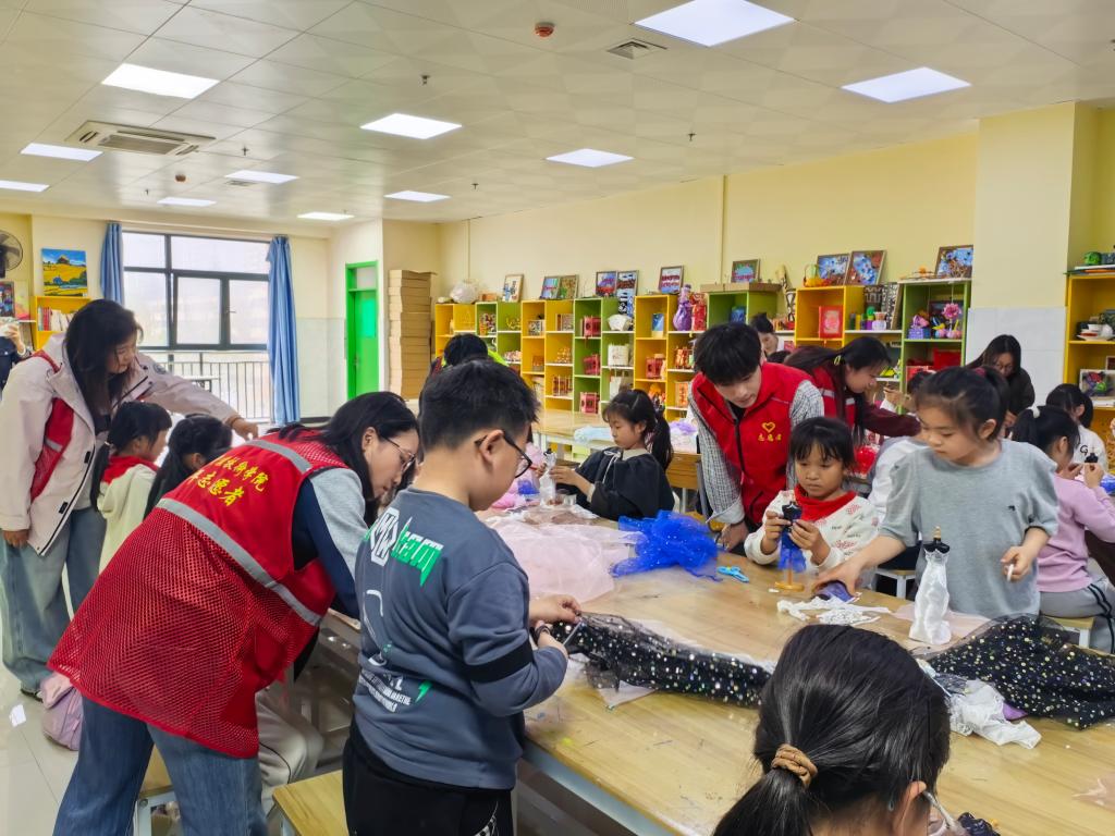 活动中,志愿教师通过精美的图片和生动的故事,向孩子们介绍了服装设计的基本概念、美学元素及材质运用知识。志愿学生发挥专业特长,引导孩子们观察不同布料、网纱的质感与光泽,理解材质与造型的关系,从视觉表达的角度,启发孩子们大胆构思属于自己的创意服装,让想象与设计碰撞出奇妙火花。在志愿者“一对一”的辅导下,小设计师们兴致勃勃地在迷你人体模型上缠绕、粘贴、装饰,将天马行空的想象化为一件件充满童趣的立体作品。