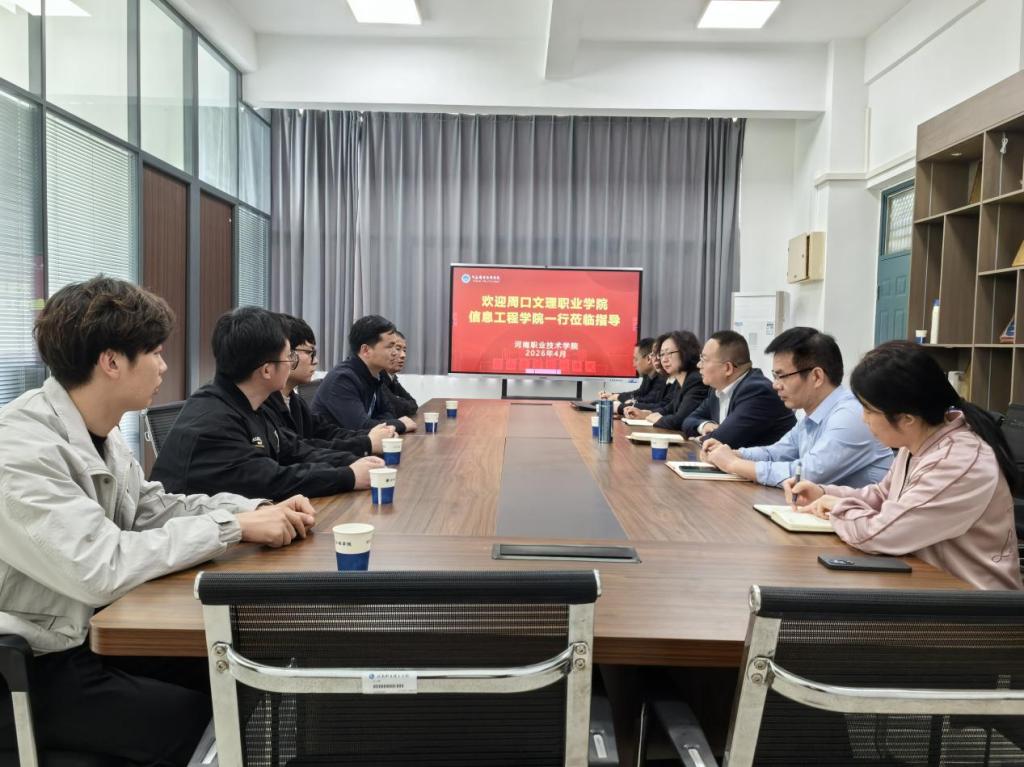 近日,周口文理职业学院信息工程学院何元飞院长一行5人来学校控制工程学院考察交流。交流会在智行楼305会议室举行,学院党总支书记、院长王东辉主持会议,学院领导班子成员及相关教师参会,双方围绕学科专业建设、人才培养、课程设置及实训室建设等核心议题进行深入交流。