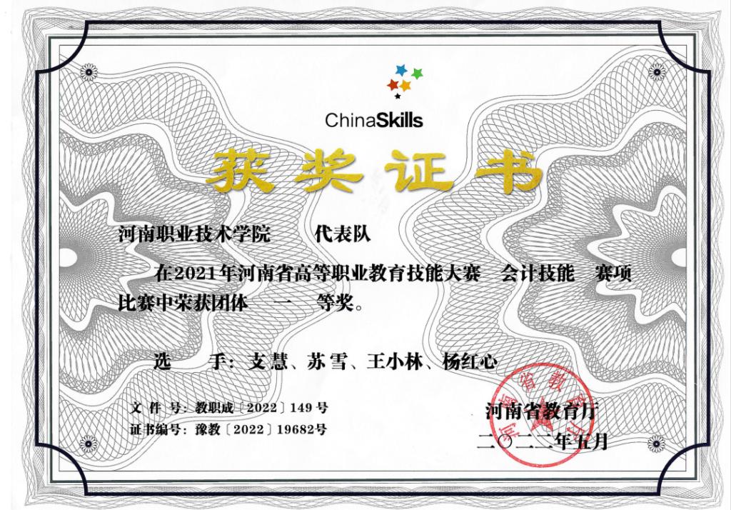 功夫不负有心人,时隔一年,学校在学院内引进了大数据工具,支慧不论是讲课还是实践,都得心应手。2021年和2023年学校又推荐她参加了全国职业院校技能大赛河南省选拔赛“会计技能”和“业财税融合大数据应用”两个赛项的教师组竞赛,均获得省一等奖的好成绩。