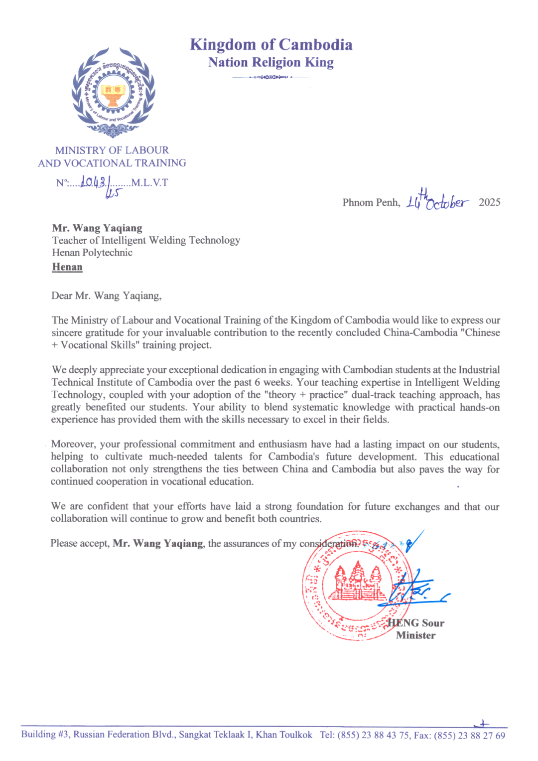 2025年10月,柬埔寨劳工与职业培训部和工业技术学院发来两封感谢信,感谢王亚强在50天中的教学奉献。王亚强说:“我觉得自己只是做了一件每位老师都会做的事,我认为我应该去做”。这份平凡中的坚守,构筑了职业教育国际合作的基石,更诠释了一所院校如何通过培养一位好老师,进而影响一批异国学生,最终加深两国友谊与合作的宏大叙事。